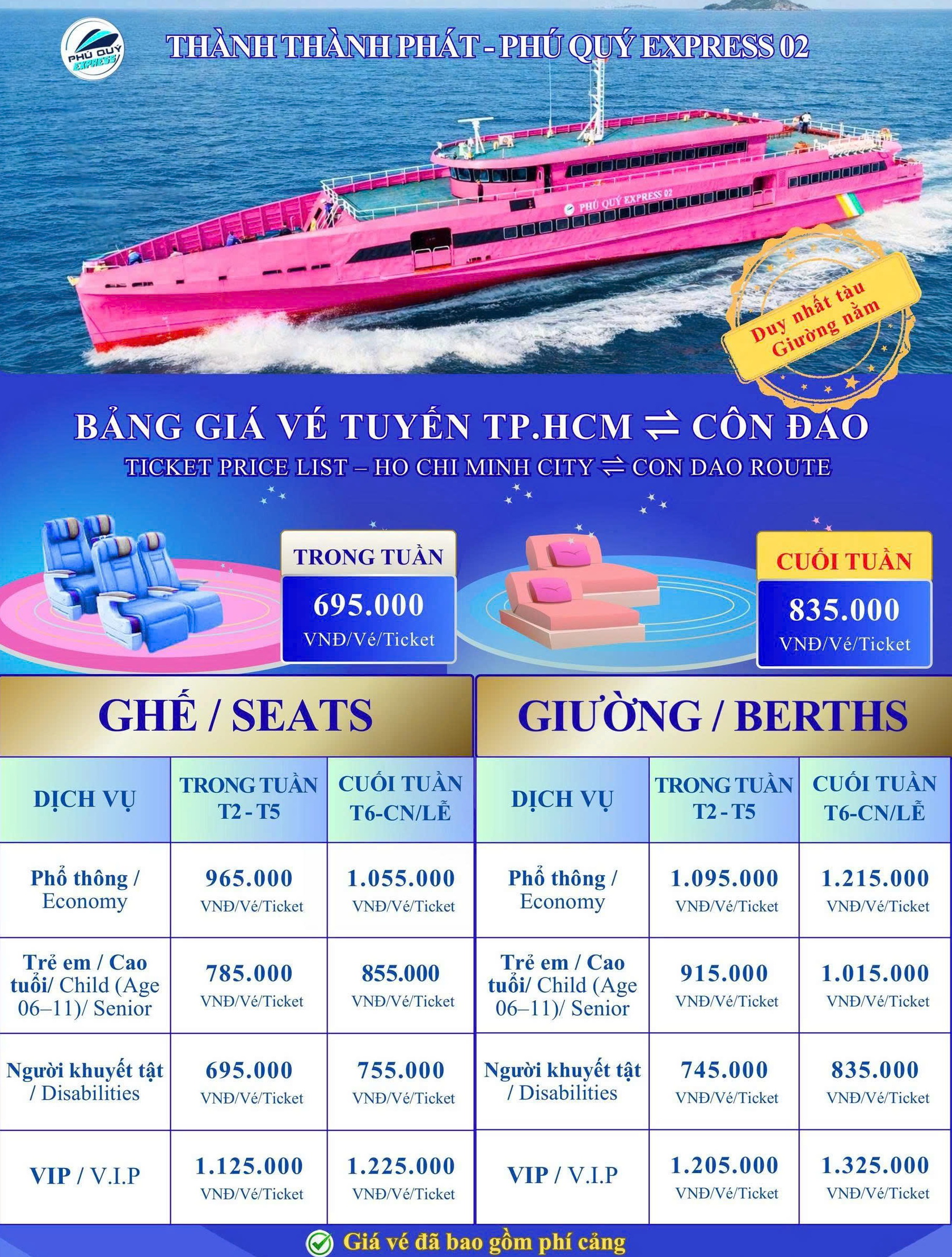 Theo thông tin từ bảng giá vừa rò rỉ, Phú Quý Express 02 tự hào là đơn vị duy nhất trên tuyến này trang bị hệ thống Giường nằm (Berths) bên cạnh ghế ngồi tiêu chuẩn. Điều này giúp hành khách có thể nghỉ ngơi trọn vẹn, đảm bảo sức khỏe suốt hành trình vượt biển.