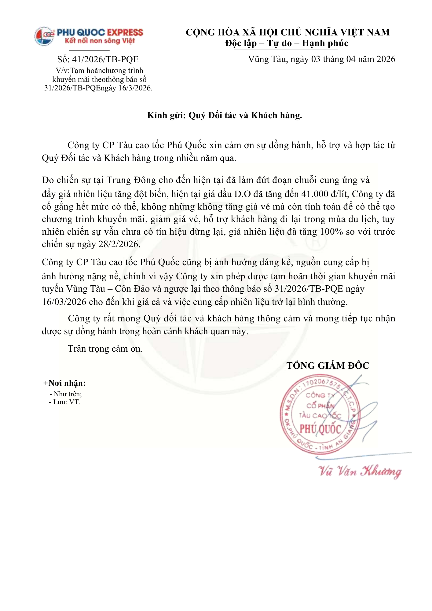 - Nội dung: Tạm hoãn thực hiện chương trình khuyến mãi đối với tuyến Vũng Tàu – Côn Đảo và ngược lại.